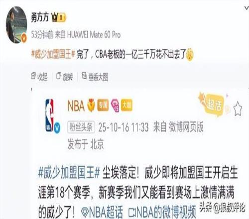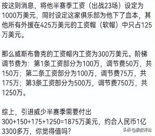 这个消息在国内引发不少争议,CBA工资帽最高只有425万,若是半个赛季就需要支付千万级别美金的合同,威少需要支付人民币过亿的投入,有媒体点评是威少团队放出消息,逼宫尽快确定合同的操作。