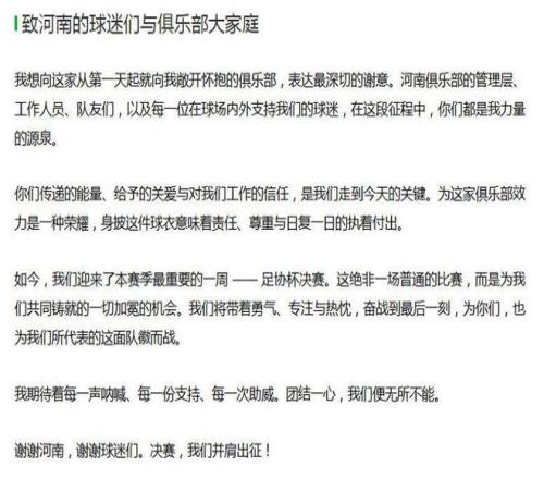 “为河南俱乐部效力是一种荣耀,身披这件球衣意味着责任、尊重与日复一日的执着付出。如今,我们迎来了本赛季最重要的一周——足协杯决赛。这绝非一场普通比赛,而是为我们共同铸就的加冕机会。我们将带着勇气、专注与热忱奋战到最后一刻,为你们也为队徽而战。我期待着每一声呐喊、每一份支持、每一次助威。团结一心,我们便无所不能。”