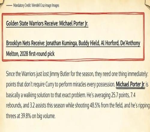 美媒《Fadeaway World》撰文建议,勇士应该将库明加、希尔德、霍福德、梅尔顿以及2028年的首轮签送到篮网,换回前锋小波特。