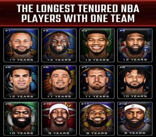 这份榜单的统计口径,实际是“现役球员在当前效力球队的在队年限”,所以它天然更偏向那种“早早进队、一直没走、球队也长期围绕他建队”的人。库里17年、格林14年、阿德托昆博13年、恩比德12年、约基奇11年、布克11年,都是这种“长期绑定”的典型。反过来,像哈登这种哪怕曾经在火箭待了很久,只要现在不在火箭,那段年限就不会出现在这张榜单里——这也是很多人第一眼容易误会的地方。
