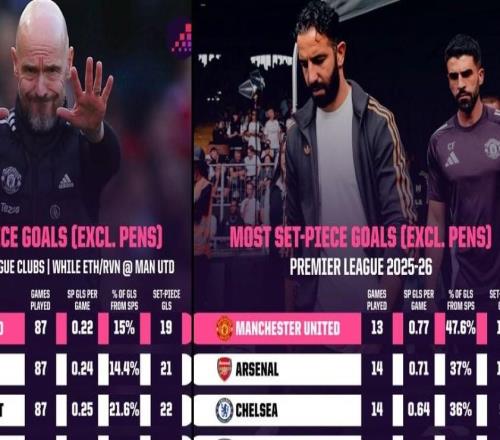 曼联13轮英超通过定位球打进10球,滕哈格时代87场仅有19球 -